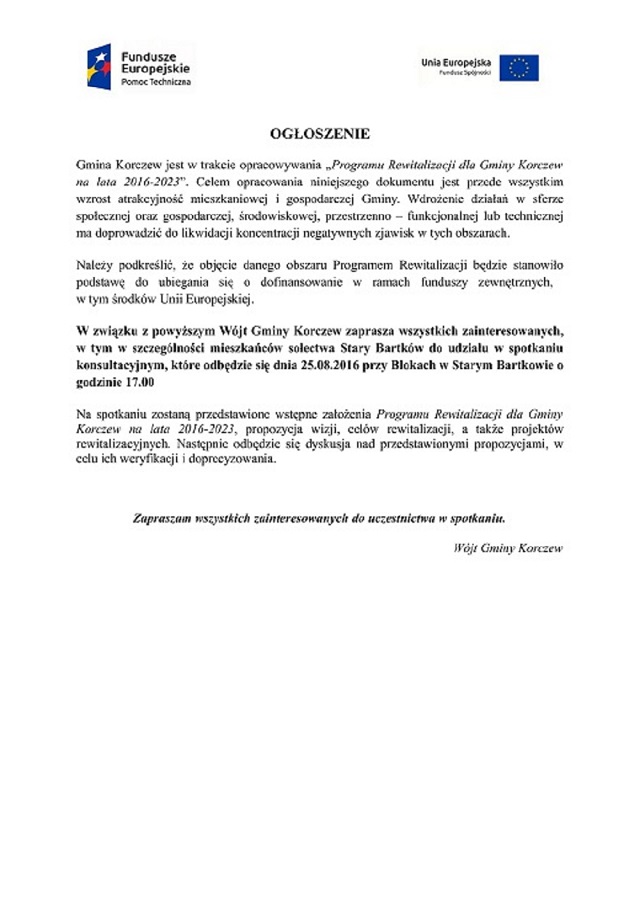 W związku z opracowaniem projektu „Programu Rewitalizacji dla Gminy Korczew na lata 2016-2023”, Wójt Gminy Korczew zaprasza do udziału w konsultacjach niniejszego opracowania.